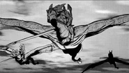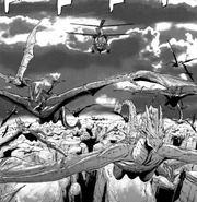 The Common Dragon, also known to referred to as "flying dragons" by residents of the Special region, are by far the most common dragon species in the Special Region, and are the only ones known to have been domesticated by the Empire. These dragons are used as mounts for the Dragon Riders/Wyvern Corps of the Empire. These dragons appear to be trained to swoop down on enemy troops and attack with their claws and teeth, as well as allow the rider to impale enemies on their lance. It is unclear whether the flying dragons are capable of breathing fire like their larger cousins, the Flame Dragon. However, the presence of dragons near a burning building at the (anime version) Battle of Ginza suggest they may be capable of breathing flames, albeit with a much lower intensity than a Flame Dragon. The scales of flying dragons are very hard, capable of resisting small arms fire, though .50 caliber machine gun fire, explosives, and heavier weapons will easily bring them down. 35mm anti-aircraft autocannons are known to be particularly effective, as seen in the Second Battle of Alnus Hill. During the Battle of Marais, helicopter's rotor blade is strong enough to shred wyvern in to mince meats. In the Manga and Light Novels many translators call them wyvern. A wyvern has two wings and two legs, most dragons have four limbs and two wings.